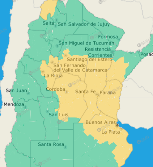Durante todo el día se prevé la presencia de tormentas, algunas de ellas con fuerte intensidad. En ese sentido, el organismo emitió una alerta amarilla que alcanza a casi toda la provincia, con excepción del extremo sur.