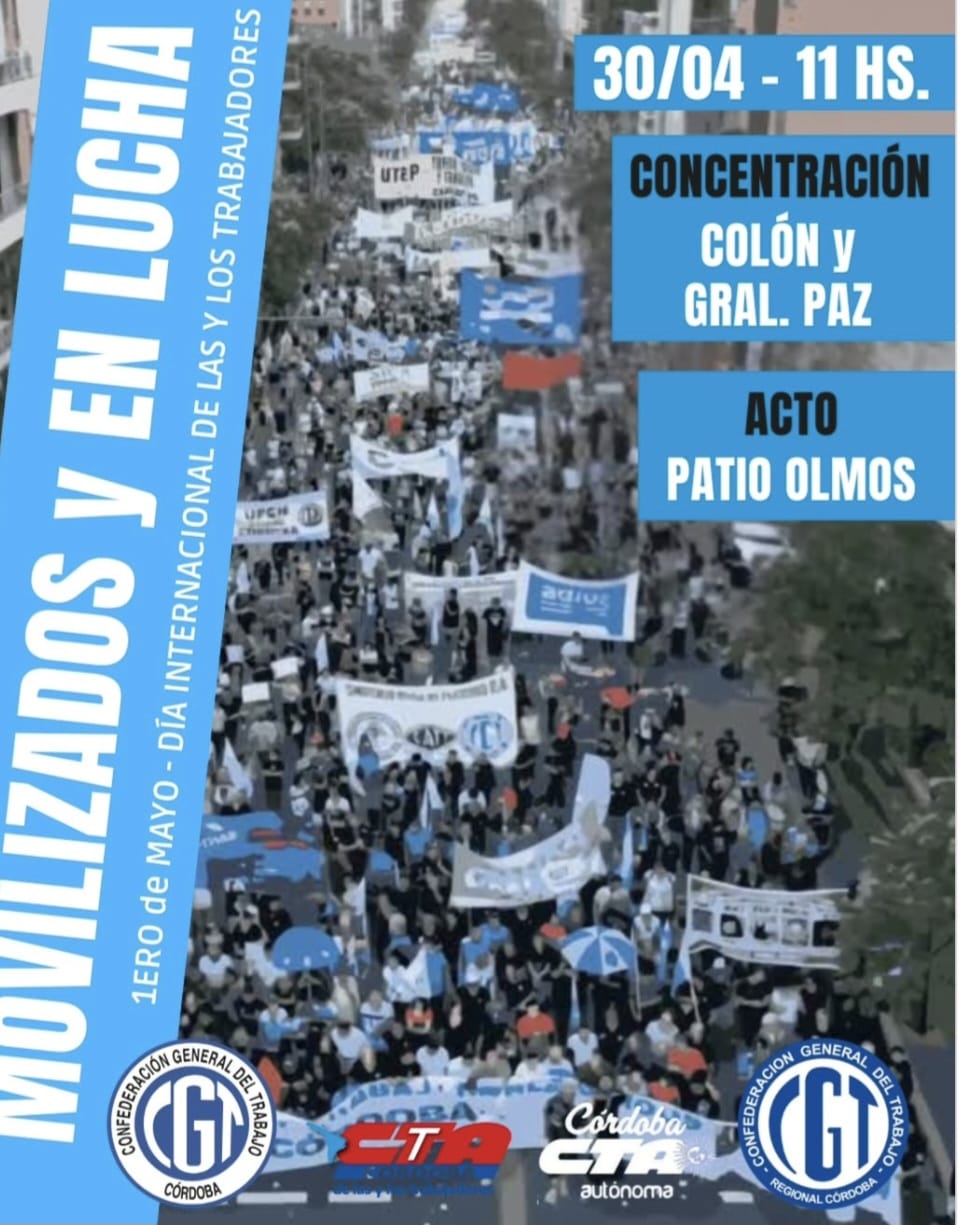 Gremios estatales y organizaciones sindicales se movilizarán este jueves por el centro de la ciudad, en la previa del Día del Trabajador. La concentración comenzará a las 11 en la intersección de las avenidas Colón y General Paz. Desde allí, los manifestantes marcharán hacia el Patio Olmos, donde se realizará un acto.