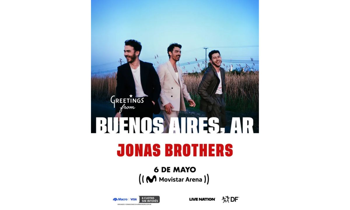 Los Jonas Brothers confirmaron su regreso a la Argentina para el próximo 6 de mayo en el Movistar Arena. En el marco de su gira mundial "Greetings From Your Hometown", la banda celebrará sus 20 años de trayectoria junto al público local. Esta quinta visita al país promete ser un hito tras el éxito de su séptimo álbum de estudio lanzado en 2025.