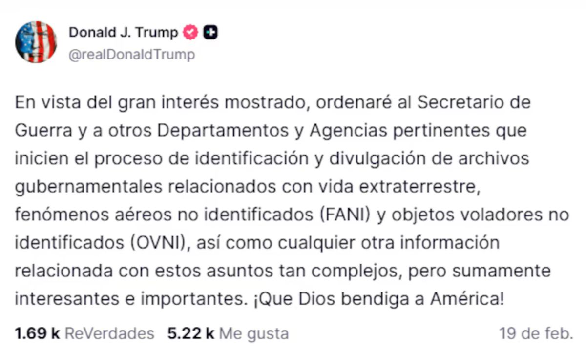 El presidente de Estados Unidos, Donald Trump, instruyó a diversas agencias gubernamentales para iniciar la desclasificación de archivos vinculados a ovnis y vida extraterrestre. A través de su plataforma Truth Social, el mandatario confirmó que el Secretario de Guerra deberá coordinar la publicación de información sobre fenómenos aéreos no identificados (UAP). Esta decisión responde al creciente interés social por conocer la verdad sobre estos eventos complejos e importantes para la seguridad nacional.
