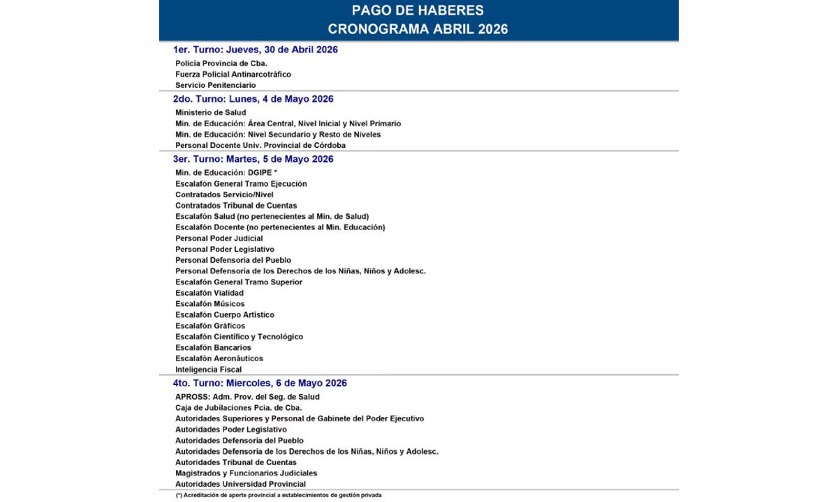 Tras el receso del fin de semana, la actividad administrativa retomará los depósitos el lunes 4 de mayo. Durante esa jornada será el turno del personal del Ministerio de Salud y gran parte del sector educativo. Percibirán sus sueldos los docentes de nivel inicial, primario, secundario y el personal de la Universidad Provincial de Córdoba.